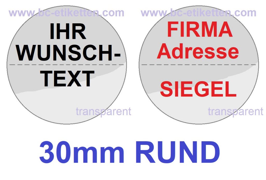 Verschluss-Etiketten 30mm rund - transparent - bedruckt mit Text nach Wunsch